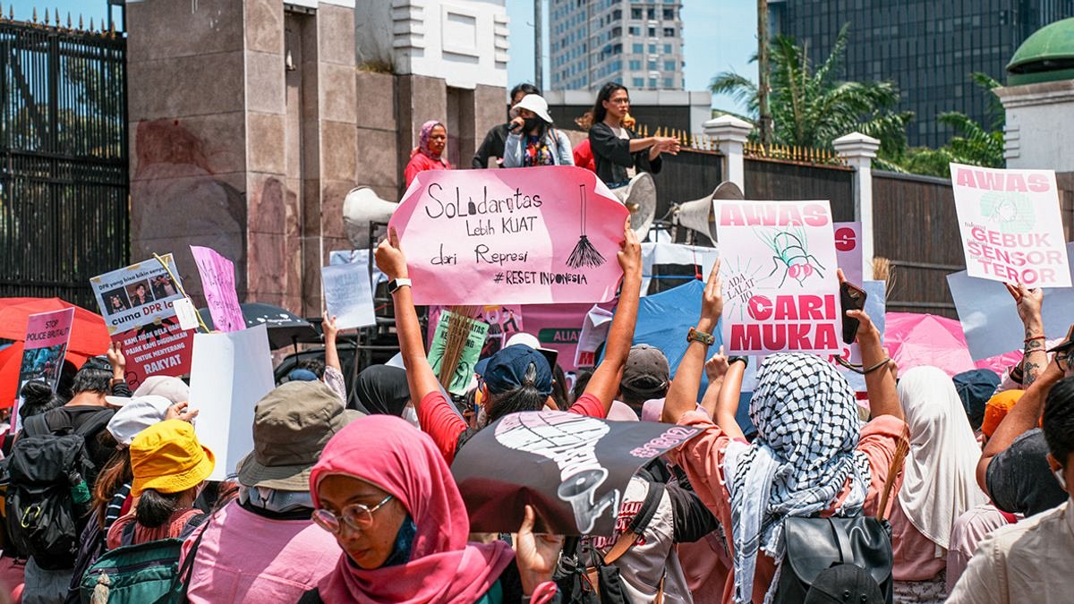 Indonésie, août 2025 : Des femmes ont défilé sous des banderoles roses contre la violence d’État, les lois anti-travail et la réécriture des manuels d’histoire visant à blanchir la dictature de Suharto.