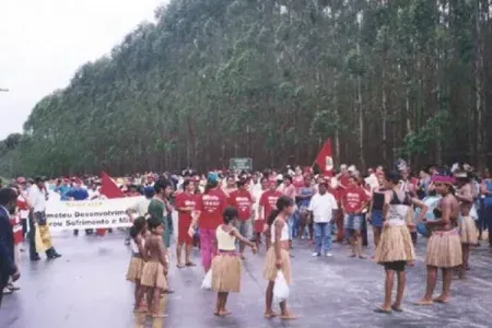 En cette année 2026, nous célébrons le 20e anniversaire de l’occupation d’Aracruz Celulose par les femmes du Mouvement des travailleurs ruraux sans terre (MST), de Via Campesina et de la Marche mondiale des femmes, un événement marquant dans la radicalisation de la lutte des femmes dans notre pays et dans plusieurs pays d’Amérique latine. Les femmes ont détruit les plants d’eucalyptus d’Aracruz Celulose, sous le slogan « Non au désert vert », en raison des vastes plantations de monoculture d’eucalyptus. Cette multinationale a eu un impact sur plusieurs territoires autochtones et peuples traditionnels, asséchant les sources d’eau de nombreuses communautés par l’exploitation des biens communs de la nature, dans le seul but de garantir toujours plus de profits.