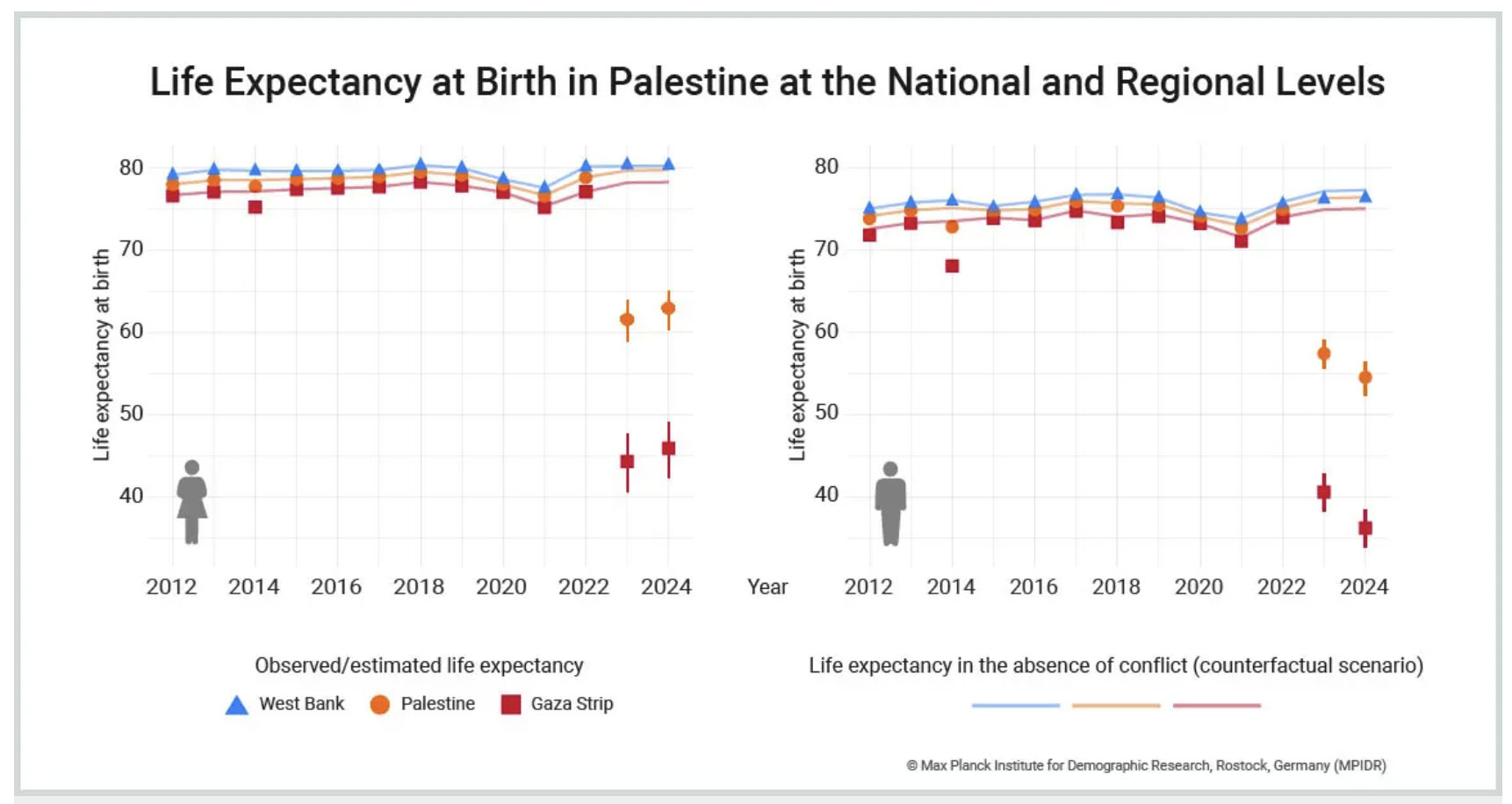 [L’espérance de vie à la naissance est indiquée au niveau national (en jaune) et régional, en utilisant les distributions par âge du ministère de la Santé (GMoH) pour la bande de Gaza (en rouge) et celles de B’Tselem pour la Cisjordanie (en bleu) pour 2023 et 2024. Les formes (triangle: Cisjordanie, rond: Palestine et carré: bande de Gaza) indiquent l’espérance de vie observée. Les scénarios contrefactuels de l’espérance de vie sans décès liés au conflit entre 2012 et 2024 sont indiqués par les lignes. Pour 2023 et 2024, les formes représentent la valeur moyenne et les intervalles indiquent les intervalles de crédibilité à 95%. © MPIDR]