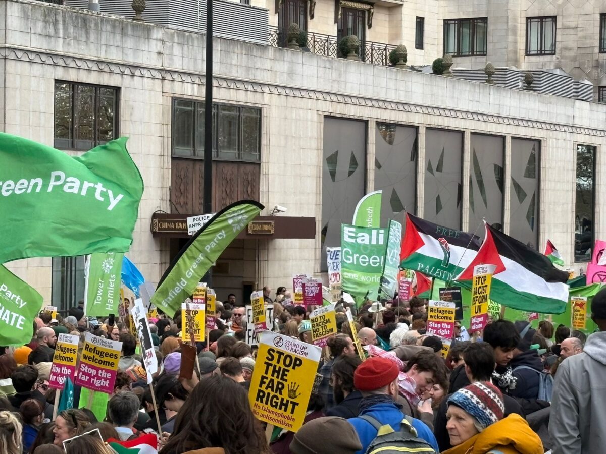 J’ai trouvé de petits groupes de membres du Parti Vert ou de simples sympathisants marchant avec des amis et de la famille, souvent avec des pancartes faites maison référençant Zack Polanski, Hannah The Plumber, ou jouant sur l’étiquette de « menace verte ». Beaucoup de ces personnes étaient non seulement nouvelles au Parti Vert et à la politique organisée ; dans de nombreux cas, elles n’avaient jamais participé à une manifestation. Espérons que la taille et le spectacle saisissants de la marche Together constitueront une inspiration durable et une impulsion pour une activité militante continue. Ceux d’entre nous qui ont réussi à rejoindre le bloc « officiel » du Parti Vert, tout au fond de la marche, derrière un bataillon de percussionnistes samba d’Extinction Rebellion, ont quand même trouvé un rassemblement d’environ un millier de personnes, reconnaissable à un grand nombre de banderoles locales du Parti Vert. Des partis verts de toute la Grande-Bretagne étaient représentés, mais beaucoup, peut-être la plupart, n’ont pas encore leurs propres banderoles. C’est là que réside un problème pour les Verts. Il n’y avait aucune pancarte ni tract produits centralement par le GP. Cela ne semble pas être une question de moyens. Comparé à il y a deux ans, le Parti Vert et ses sections locales disposent de ressources financières abondantes. Il s’agit plutôt d’une question de culture interne au GP et d’une focalisation excessive sur les campagnes électorales locales, au détriment d’une approche plus générale visant à rallier de larges couches de la population à la politique du GP et à construire une base solide au sein des mouvements sociaux.