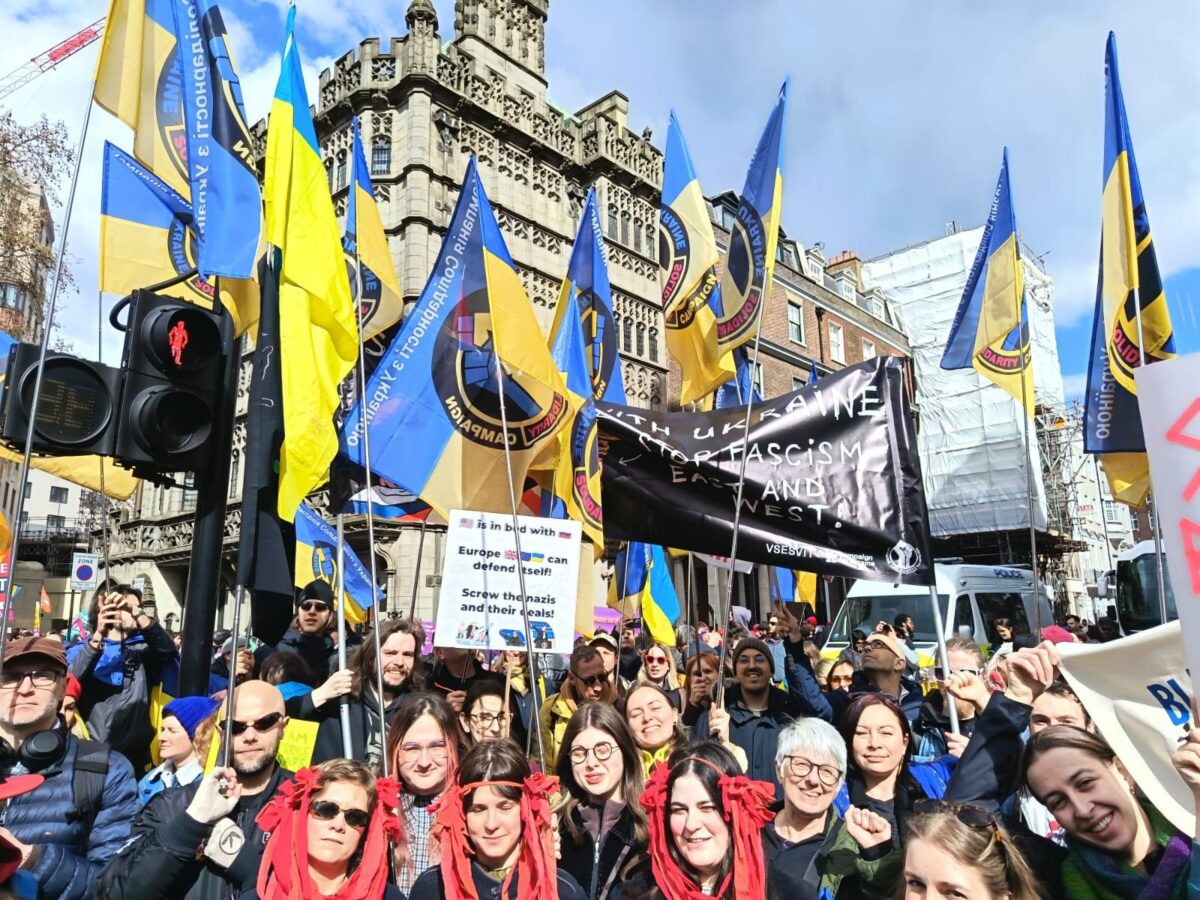 Un cortège de soutien à la Palestine, fort de plusieurs milliers de personnes, a rejoint la marche, et des drapeaux palestiniens étaient visibles dans toute la manifestation. Des membres de Democrats abroad (démocrates étatsuniens en exil) brandissaient des masques en papier mâché « No Kings », en référence aux immenses protestations qui se déroulaient ce même jour aux États-Unis contre Trump. Les messages anti-Trump étaient également nombreux. Un imposant contingent d’Europe de l’Est a marqué les esprits : son message était simple – il faut combattre l’extrême droite non seulement en Europe occidentale, mais aussi en Europe orientale. Beaucoup dans ce contingent étaient ukrainiens, dont les proches sont en première ligne face à l’annexion tentée par Poutine ou vivent sous des bombardements réguliers. L’un des slogans scandés était : « De l’Ukraine à la Palestine, l’occupation est un crime ». La campagne de solidarité avec l’Ukraine y était très visible, drapeaux déployés.