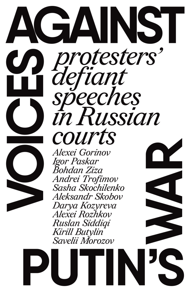 Au cœur de Voices Against Putin’s War se trouvent dix discours prononcés devant les tribunaux par des personnes qui se sont opposées à la guerre d’agression menée par la Russie en Ukraine et qui ont été arrêtées et jugées pour cela. La plupart d’entre elles purgent actuellement de longues peines de prison pour des « crimes » inventés de toutes pièces par la machine répressive de Vladimir Poutine. Outre ces discours, nous avons inclus : d’autres déclarations publiques – publications sur les réseaux sociaux, lettres et interviews – dans lesquelles les protagonistes ont présenté leurs arguments ; les déclarations de deux autres militant·es persécuté·es, faites en dehors du tribunal ; et un résumé de 17 autres discours anti-guerre prononcés devant les tribunaux. Nous espérons que la publication de ces traductions en anglais permettra à un plus large public de connaître les motivations de ces résistant·es.
