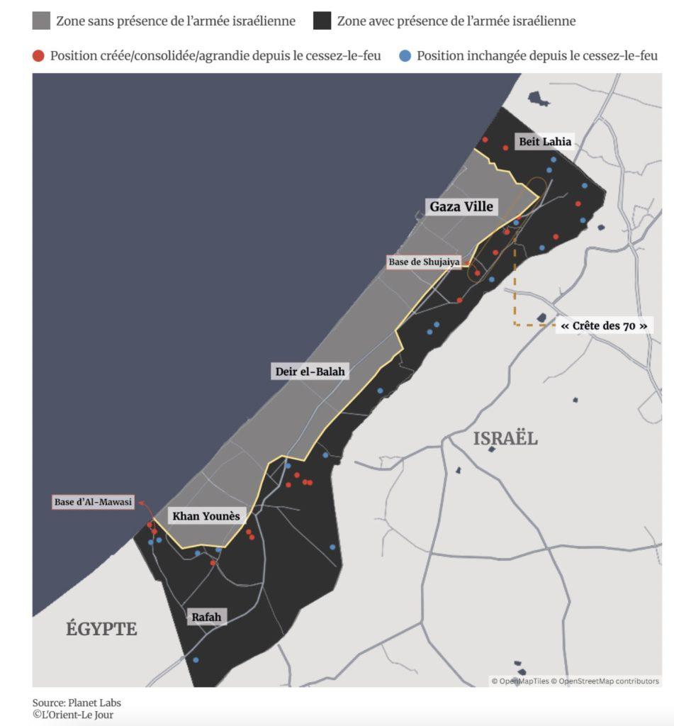 Près de 60% de la bande de Gaza reste sous occupation israélienne: il s’agit de la zone orientale ou «verte», en expansion, dans laquelle les forces israéliennes rasent systématiquement toutes les infrastructures restantes. La partie occidentale de la ligne, ou zone «rouge», qui représente environ 40% de la superficie de l’enclave, est celle où se concentre la quasi-totalité de la population gazaouie et où le Hamas exerce encore un certain contrôle.