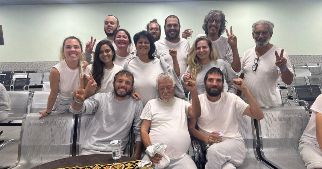 Nous venons de recevoir les photos de la délégation brésilienne de la Flottille, le poing levé, à son arrivée en Jordanie, une étape du retour au Brésil Et même si, entre hier et aujourd’hui, des dizaines de délégations ont déjà quitté les cachots de l’État génocidaire, six militants de plusieurs nationalités sont toujours emprisonnés.