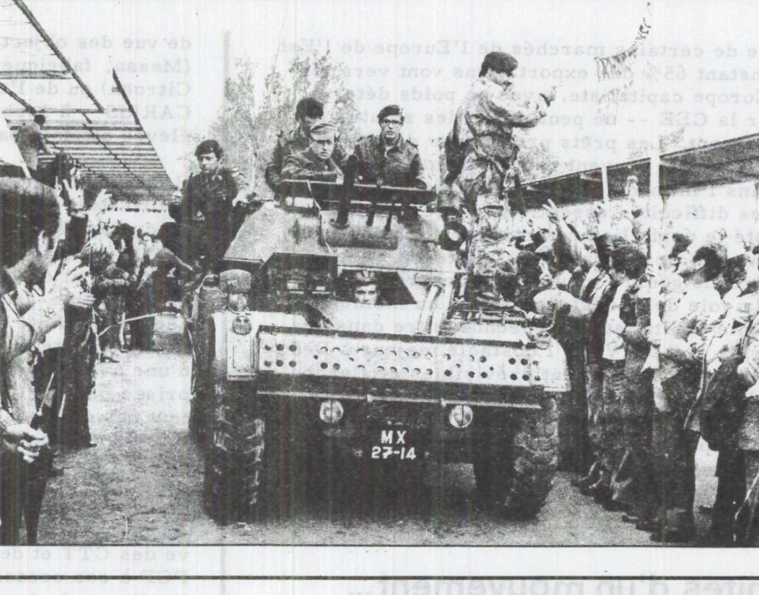 L’ouverture de certains marchés de l’Europe de l’Est — pour l’instant 65% des exportations vont vers les pays de l’Europe capitaliste, avec un poids déterminant pour la CEE — ne peut offrir des solutions de remplacement. Les prêts promis par divers pays du Marché Commun peuvent rendre moins critique la situation dans l’immédiat, mais certainement pas résoudre les difficultés essentielles face auxquelles est confronté le capitalisme portugais. Dernier touché par la vague d’expansion capitaliste en Europe après la seconde guerre mondiale, il cherche à s’engager sur la voie de la restructuration au moment où l’économie capitaliste européenne entre dans une phase de crise aiguë. Voilà l’obstacle majeur. Dès lors, les choix du capital sont prévisibles et s’annoncent déjà. L’attaque contre le pouvoir d’achat, contre l’emploi, et la restriction des possibilités d’organisation indépendante syndicale et du droit de grève vont devenir l’épine dorsale de la politique de la Junte et de son paravent : le « gouvernement provisoire ».