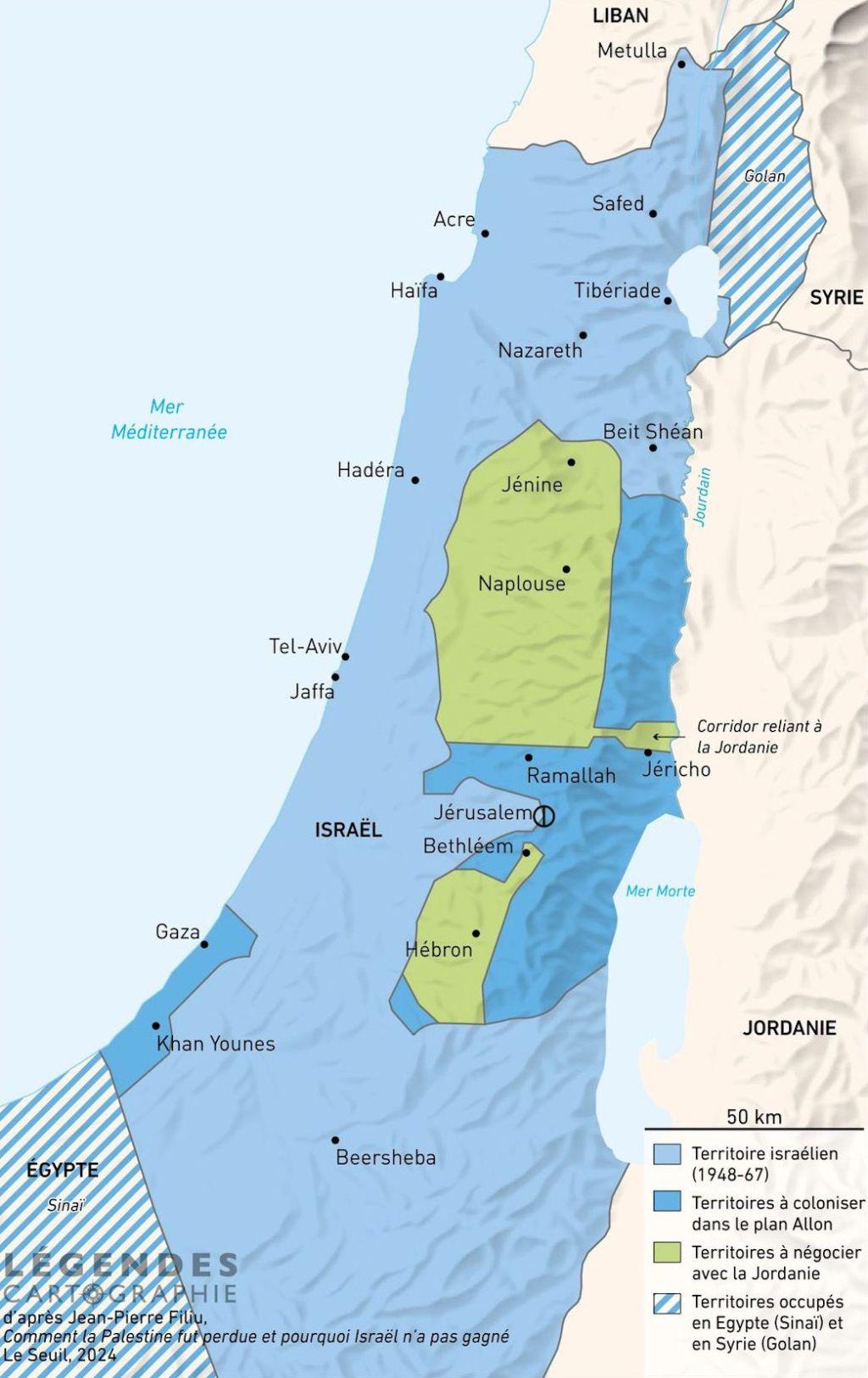 D’après l’Institut Akevot de recherches sur le conflit israélo-palestinien, le 18 octobre 1967, Yigal Allon, alors ministre du Travail, a soumis, huit mois avant de devenir vice-Premier ministre d’Israël, au Comité ministériel des affaires de sécurité, une proposition 14 de suppression de la ligne verte des cartes israéliennes officielles, d’annulation des accords d’armistice de 1949, et de redéfinition des frontières. La nouvelle carte incluait la Cisjordanie, la bande de Gaza, le plateau du Golan syrien et la péninsule du Sinaï.